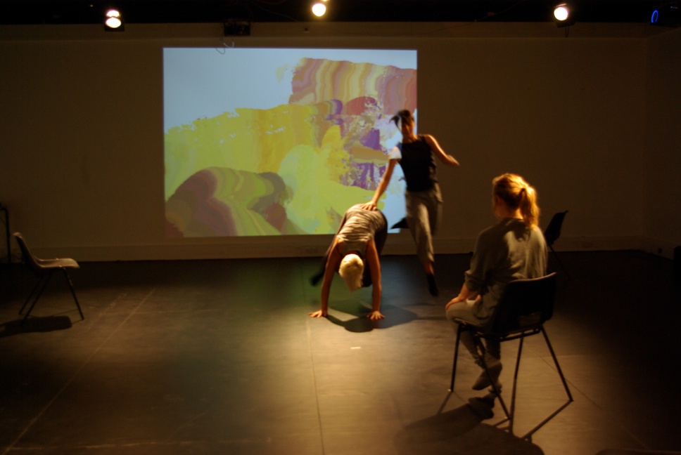 Whitespace Whitespace is a structured dance improvisation performed within a movement-interactive computer-produced multimedia installation environment. The improvisation directions are by Kathleya Afanador and the computer programming is by Allen Fogelsanger. The installation environment is produced by a conglomeration of Max 5 programs called Canvas+Triggers+Snaps. Canvas projects color "paintings" inscribed by movement. A video camcorder records changes in luminosity from one video frame to the next; as people move within the installation space, their movement generates colorful visual traces on the projected output video. Triggers is an audio component that may respond with several different outputs: "swishes," footsteps, piano and percussion each follow different algorithms for interacting with visitors' movement. Snaps is triggered by stillness; its response is to take a snapshot of whatever Canvas is showing at the time. It projects this new snapshot for a short period before sequencing through a series of older snapshots, each triggered by one of the percussion sounds of Triggers. The performers in Whitespace work with structured improvisations to create a human-installation environment that varies from highly formalized to rather chaotic. Over the course of five to nine hours, it fluctuates between periods of sculptural stillness and periods of dynamic variation. Within this installation space there is no distinction made between "performance space" and "audience space"--they are intermingled. Viewers walking through the performance-installation unavoidably insert themselves into the work and are invited to play with it, their very presence creating tangible effects in the audio and visual media. Performed in Brunel University's Antonin Artaud Building